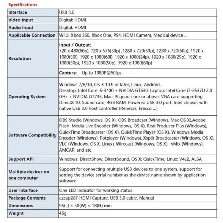 کپچر استریمینگ EZcap 287 اولین محصول شرکت EZCap که دارای ورودی HDMI که امکان اتصلا به انواع دستگاه ها با خروجی HDMI را فراهم می کند ، دستگاه هایی مانند دوربین فیلمبردای ، کنسول بازی ، دستگاه های صنعتی ، رباتیک و ... امکان اتصال به این دستگاه را دارند. همچنین می توان از EZCap 287 برای لایو استریم و استریمینگ تصاویر بازی مورد استفاده قرار داد. ای زد کپ 287 از کنسول های مختلفی مانند PS4 - WIIU - Xbox 460 - Xbox One پشتیبانی می کند. کپچر اکسترنال HDMI با پورت USB 3.0 مدل Ezcap 287 کپچر دارای سیستم استاندارد UVC می باشد و بدون نیاز به نصب درایور خاصی می توانید از آن استفاده کنید . ای زد کپ توسط یک USB 3.0 به کامپیوتر و لپ تاپ متصل می شود ، تحت سیستم عامل های مختلف از جمله ویندوز ، مک - لینوکس قابل اجراست . ای زد کپ توسط نرم افزارهای مختلفی مانند Streaming و Webcasting و ویدئو کنفرانس ها مثل Wirecast ، Adobe Flash Media Live Encoder ، OBS Studio ، XSplit broadcaster نیز مورد استفاده قرار میگیرد. کپچر اکسترنال HDMI با پورت USB 3.0 مدل Ezcap 287 این محصول قادر است ویدئو را با کیفیت FULL HD 1080P 60 FPS را کپچر و بر روی حافظه کامپیوتر یا لپ تاپ ذخیر نماید . کپچر اکسترنال HDMI با پورت USB 3.0 مدل Ezcap 287 Ezcap287 HDMI to USB Video Capture Card Device 1080P 60fps Full HD Video Recorder For Winodws Mac Linux Support Live Streaming With ezcap287 (ezcap261/M,ezcap265/265C/ezcap266) Full HD 1080 60 game capture,just plug to your PC (Windows, Mac, Linux),no need install driver, you can use any 3rd party software to capture or stream your HD game, or other HD video source ezcap287 (ezcap261/M, ezcap265/265C) Full HD 1080 60 video capture, it allows you input 4K 30 HDMI signal, and capture/live stream full HD 1080 60 video Model ezcap266 support 4K 30 HDMI in and Output, and capture/live stream full HD 1080 60 video It also can be used as a screen sharing device for internet meeting, easily sharing presenting slides, spreadsheets, documents, and video recordings into online meetings Features USB3.0 port – To connect to computer LED – Will be on when connect to computer HDMI input port – Connect video source with HDMI cable Ezcap265 is same as ezcap287, and the only difference between ezcap265 and ezcap265C is ezcap265 is USB 3.0 port, and ezcap265C is TYPE-C port