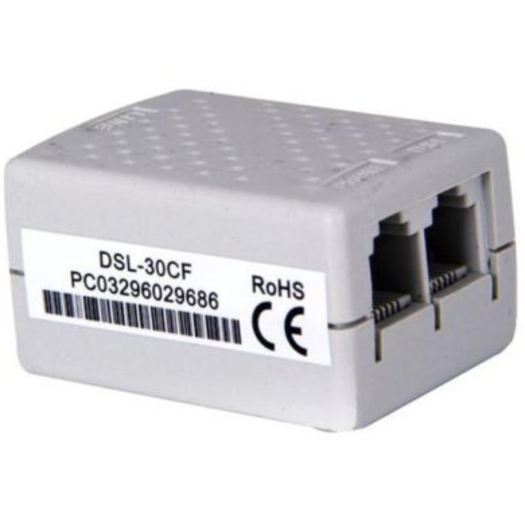 اسپلیتر DSL-30CF محصول برند دی-لینک است. این محصول در واقع نقش نویزگیر خط تلفن را بر عهده دارد و با گرفتن نویز از خط تلفن دارای اتصال ADSL به بهبود کیفیت مکالمه منجر میشود. یک سمت نویزگیر یک پورت ورودی خط تلفن وجود دارد و سمت دیگر، خروجیهای مجزای مودم و تلفن قرار دارند.